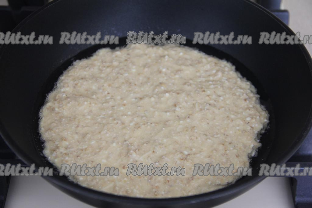 Сковороду (я жарила на сковороде диаметром 20 сантиметров) смазать маслом и хорошо разогреть. Выложить на сковороду овсяную массу. Равномерно распределить массу по дну сковороды.
