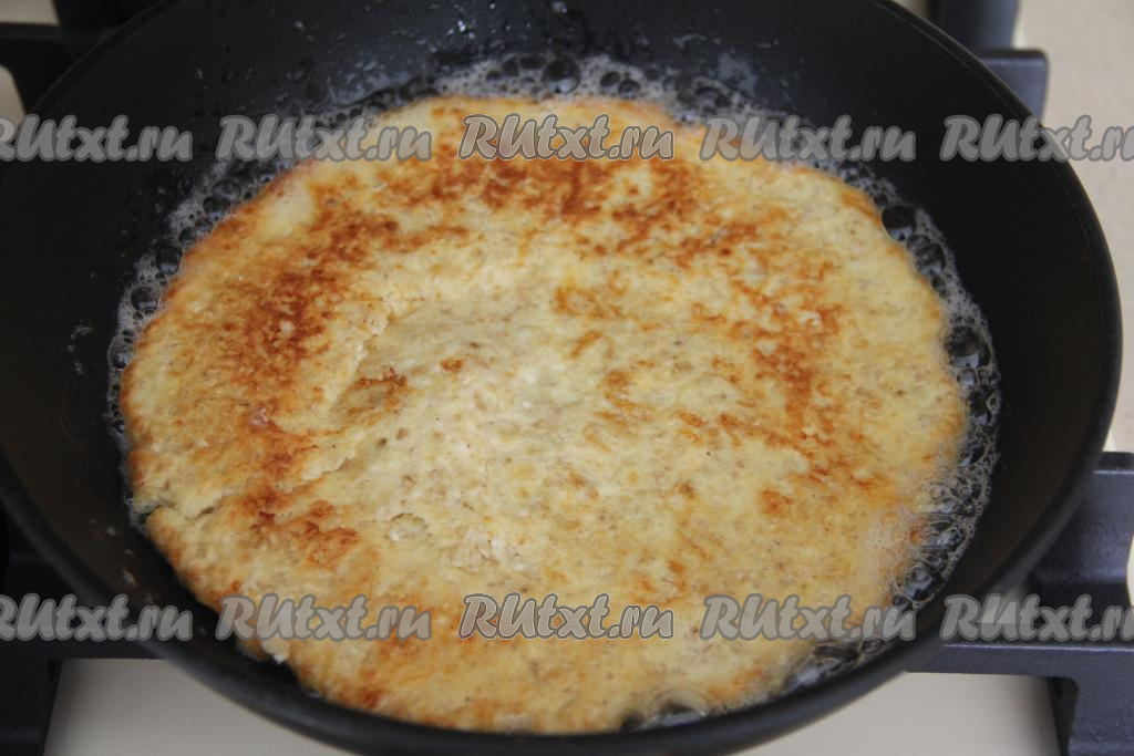 Жарить овсяноблин на среднем огне с двух сторон до золотистого цвета (примерно по 3-4 минуты с каждой стороны) и убрать с огня.
