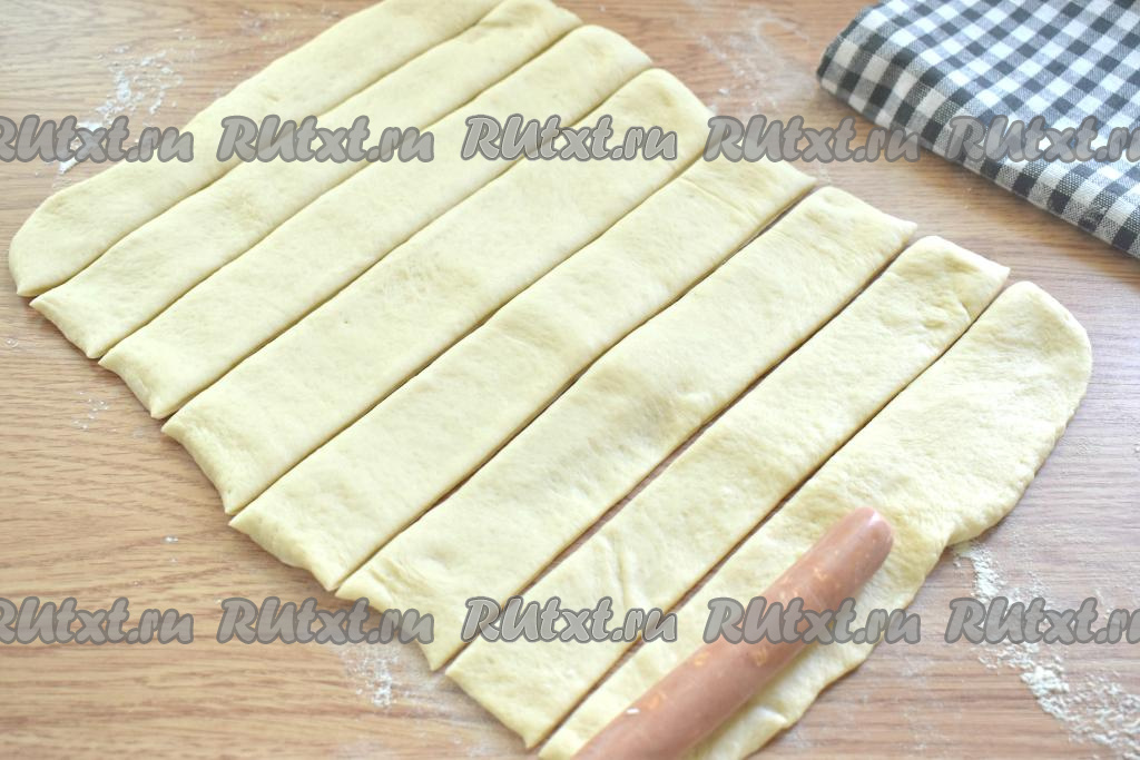 Дрожжевое тесто на столе, присыпанном мукой, раскатываем в прямоугольный пласт, ширина которого должна быть больше длины сосисок в 2 раза. Нарезаем пласт на полоски шириной примерно 2,5-3 сантиметра. Полосок должно быть столько же, сколько сосисок (у меня - 8 штук).