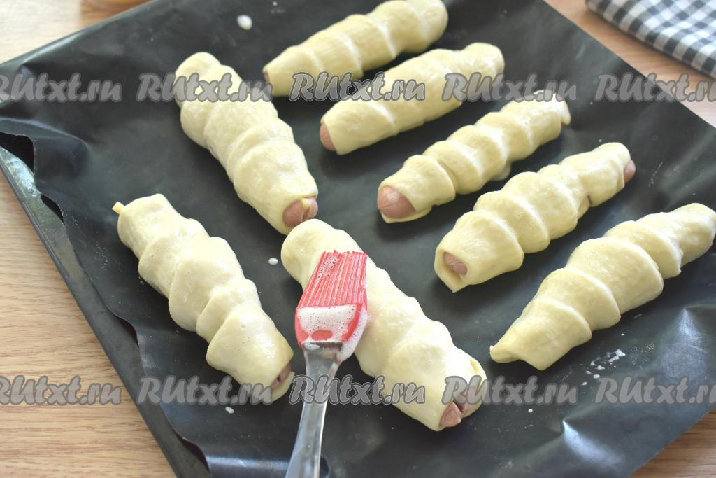 Оборачиваем полоску теста внахлёст вокруг сосиски с сыром, а затем выкладываем на противень, застеленный ковриком (или пергаментом) для выпечки. Постепенно таким образом формируем все сосиски в тесте.