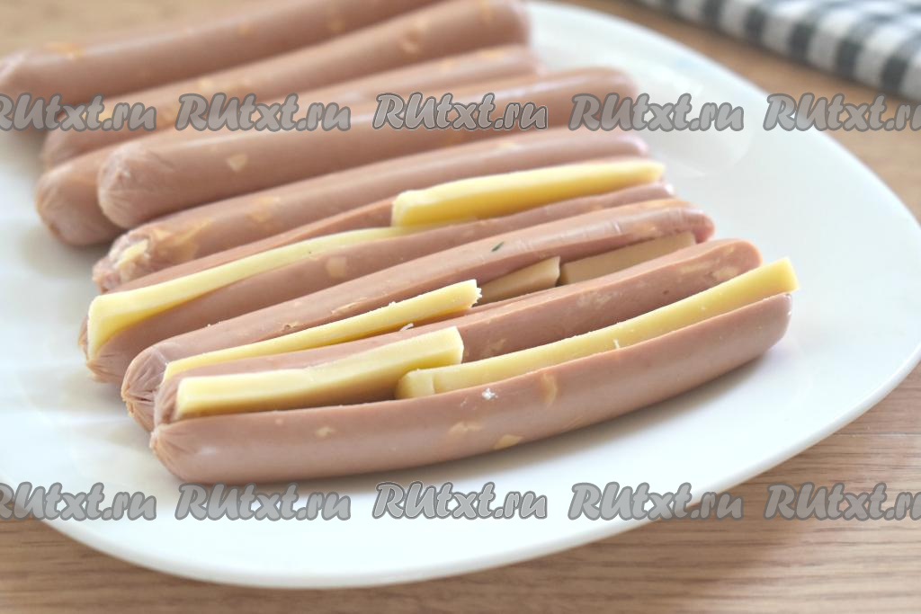 Сыр твёрдых сортов нарезаем на тонкие пластинки и вставляем в разрез каждой сосиски.