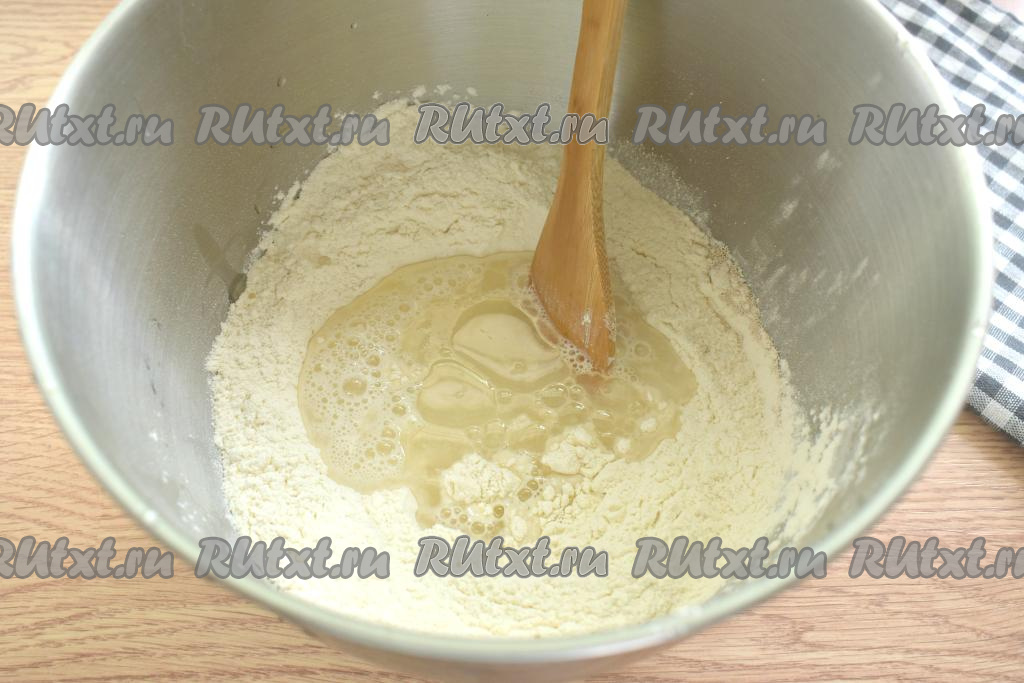В центр смеси муки и дрожжей вливаем тёплую воду (её температура не должна быть выше 40 градусов) и растительное масло, перемешиваем тесто сначала лопаткой (или столовой ложкой).