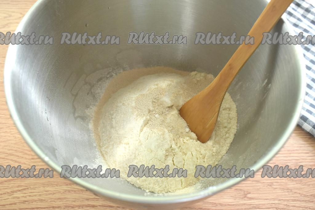 В объёмную миску просеиваем муку, сразу добавляем сахар, соль и дрожжи, хорошо перемешиваем, образуя в центре углубление.