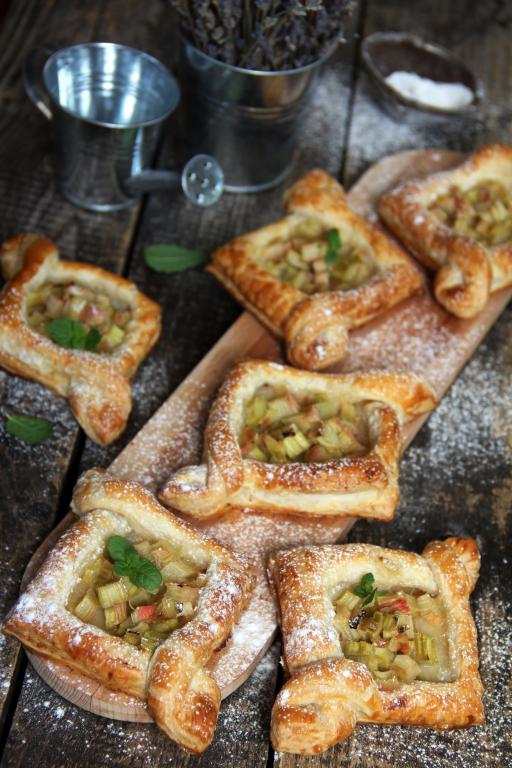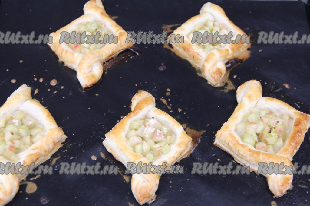 Выпекать слойки с ревенем минут 20-25 минут (до подрумянивания слоёного теста) при температуре 200 градусов.