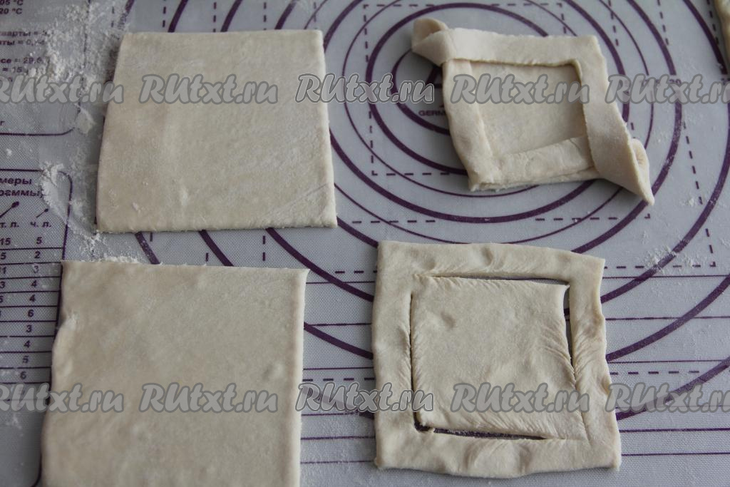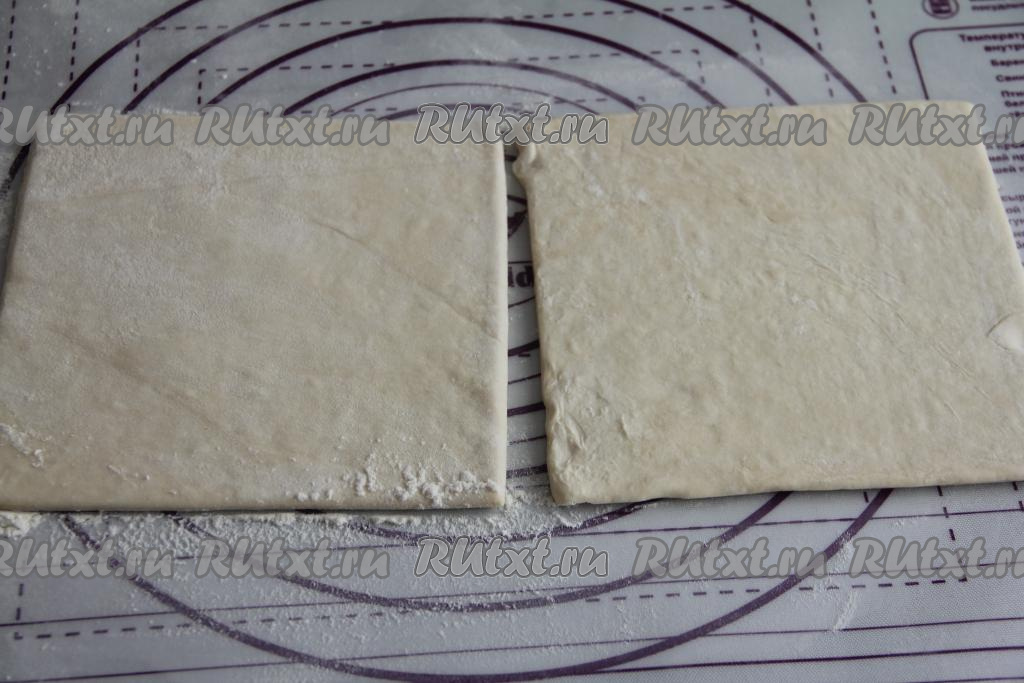 У меня слоёное тесто было в двух пластах. Каждый пласт на посыпанной мукой поверхности слегка раскатать. Разрезать каждый раскатанный пласт на 4 квадрата (из двух пластов теста получится 8 квадратных заготовок для формирования слоек).