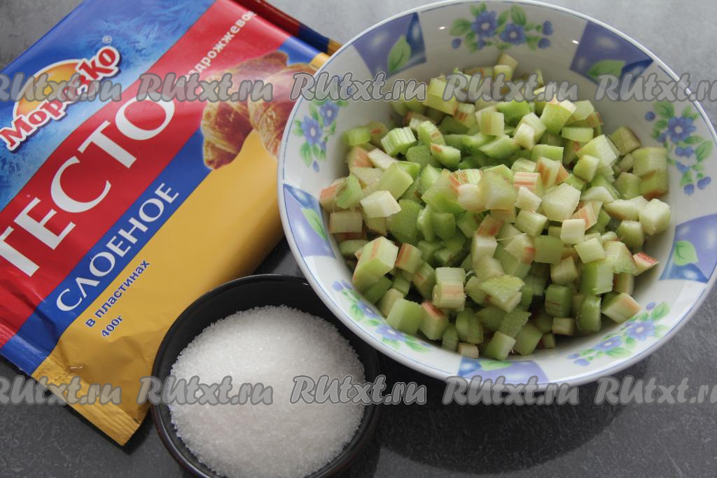 Разморозить при комнатной температуре покупное слоёное тесто. Стебли ревеня промыть водой. Снять тонкую плёночку, покрывающую весь стебель. Подготовленные стебли ревеня нарезать на мелкие кусочки, выложить в глубокую тарелку.