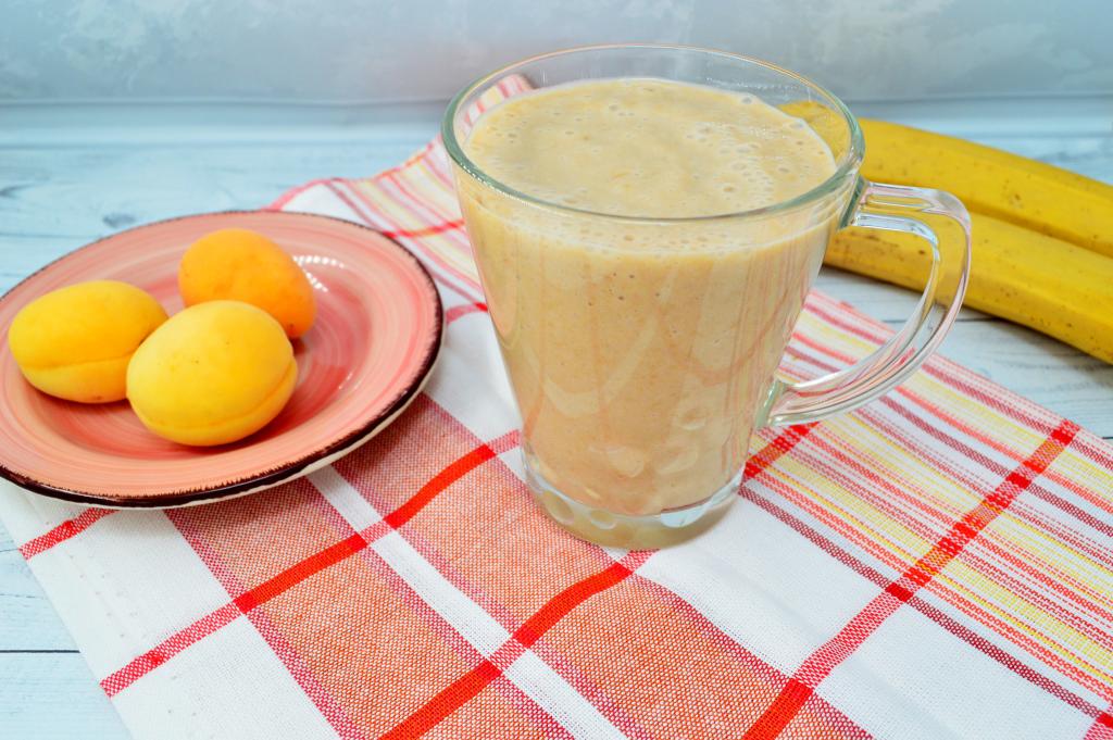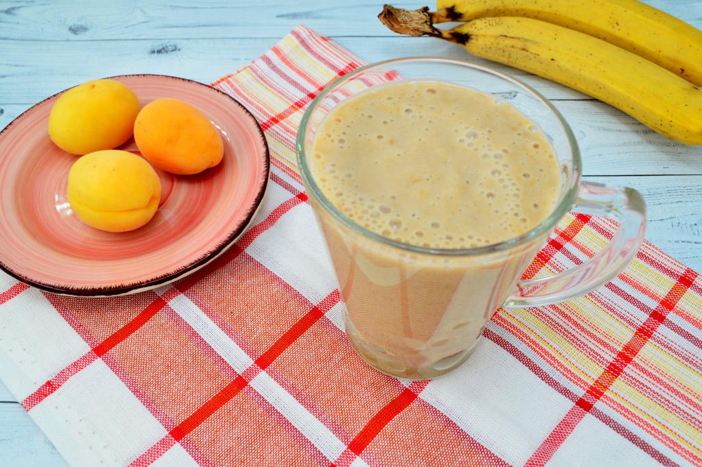 Подготовить продукты. Коровье молоко можно взять любой жирности, при желании его можно заменить на растительное молоко (например, на миндальное, кокосовое, соевое, овсяное). Банан лучше брать спелый или даже переспелый. Абрикосы тоже лучше использовать спелые.