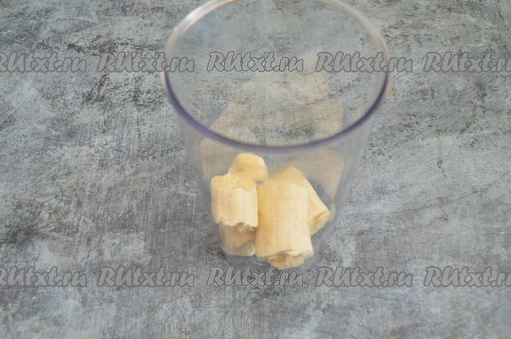В чашу погружного блендера выложить очищенный банан, поломанный на кусочки.