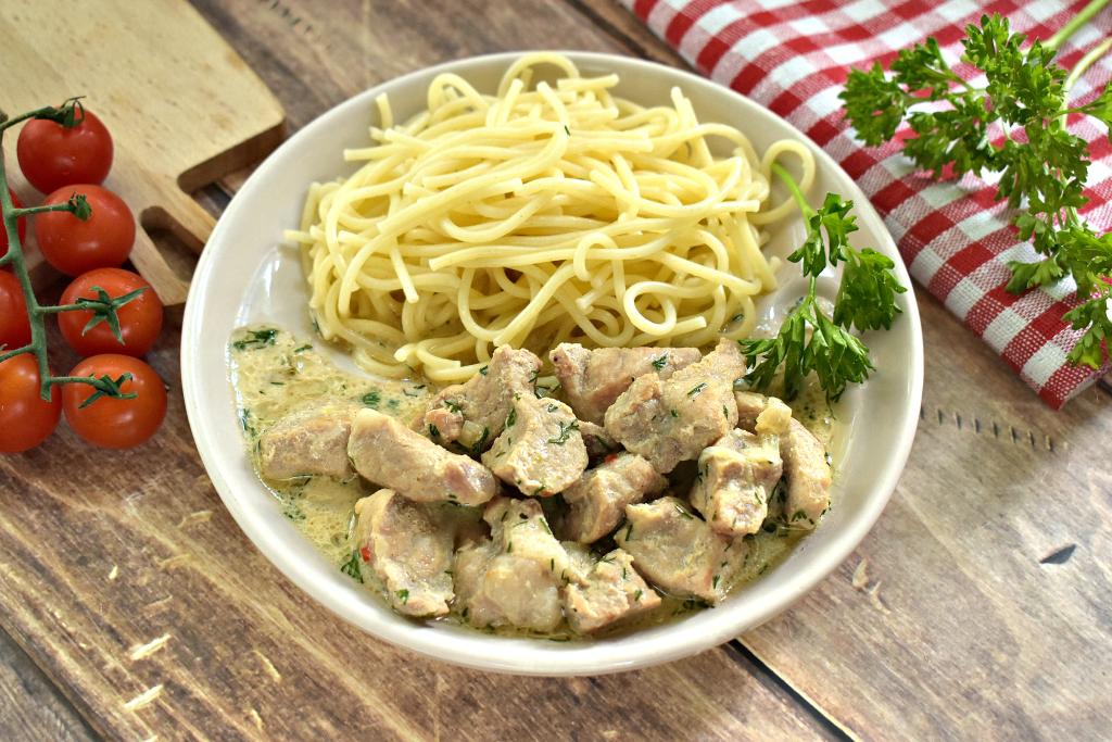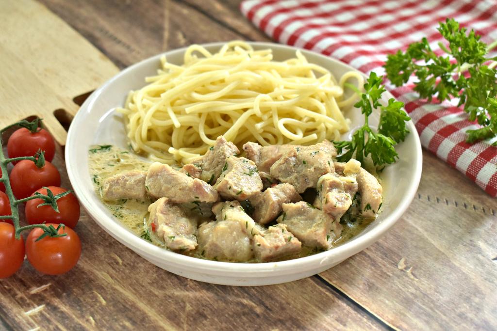 К столу нежнейшие кусочки свинины я подала с макаронами, полив сметанно-горчичным соусом, в котором тушилось мясо. Получилось вкусно и сытно!