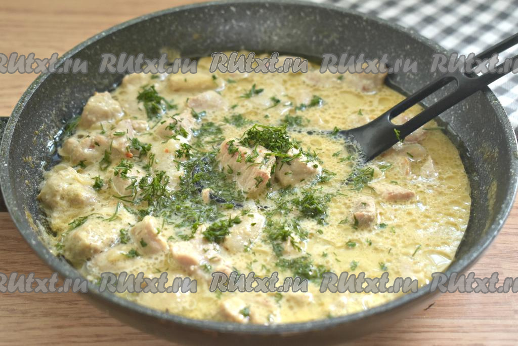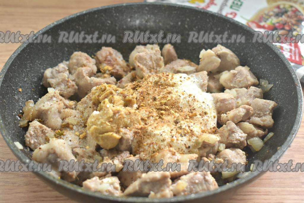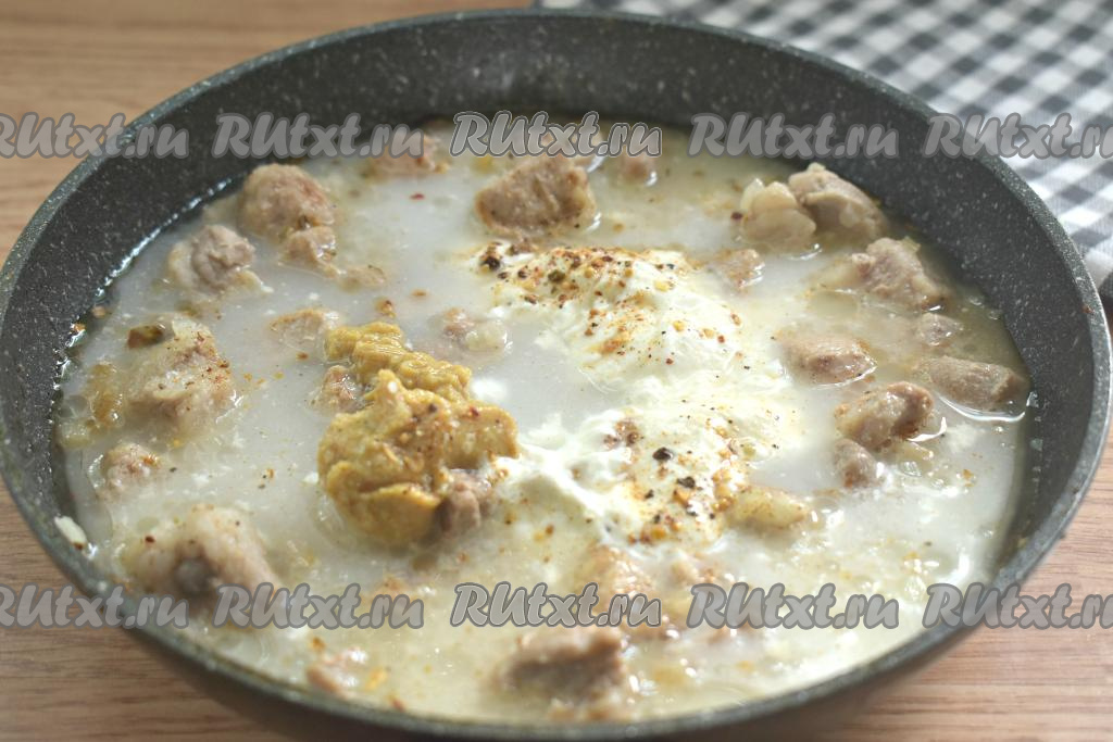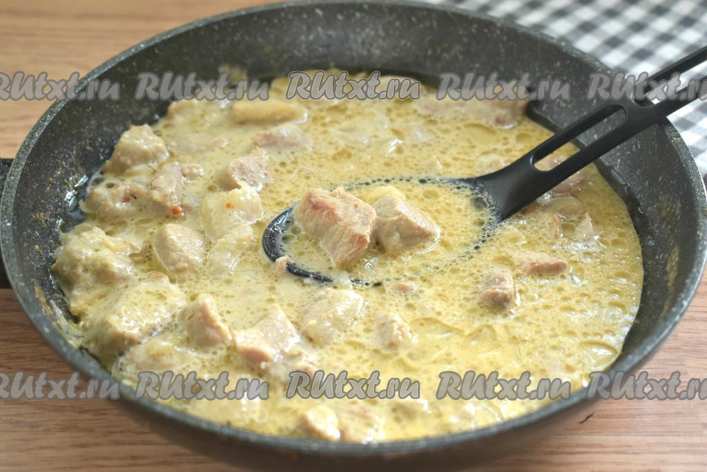 Перемешиваем содержимое сковороды и доводим до кипения. Затем убавляем огонь до минимального, сковороду накрываем крышкой и тушим свинину в сметанно-горчичном соусе 25 минут.