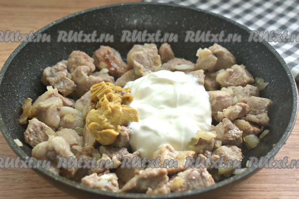Далее на сковороду добавляем сметану и горчицу.