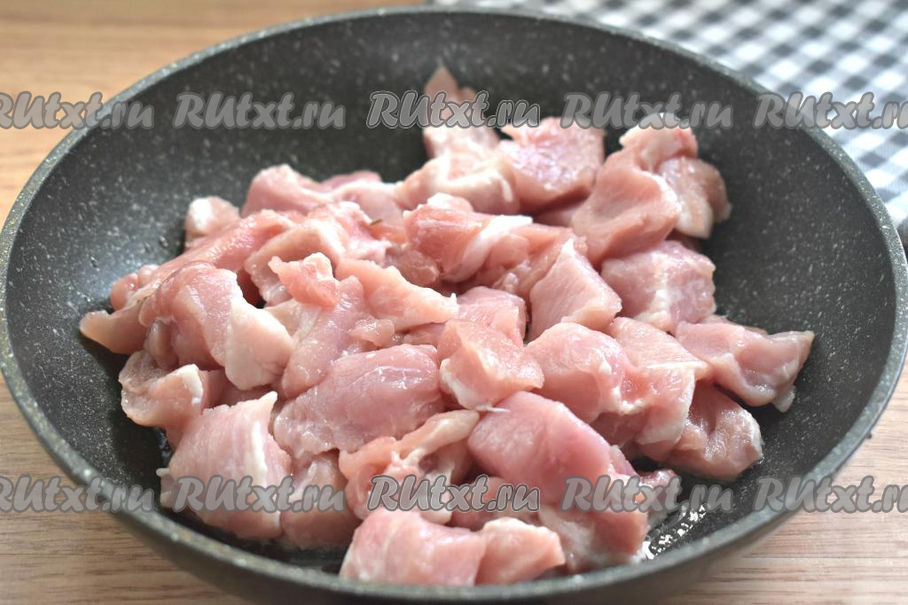 Наливаем на сковороду растительное масло, ставим на огонь. Когда масло разогреется, выкладываем нарезанную свинину и, периодически помешивая, жарим её на достаточно сильном огне 10 минут (до изменения цвета со всех сторон и лёгкого подрумянивания мяса).