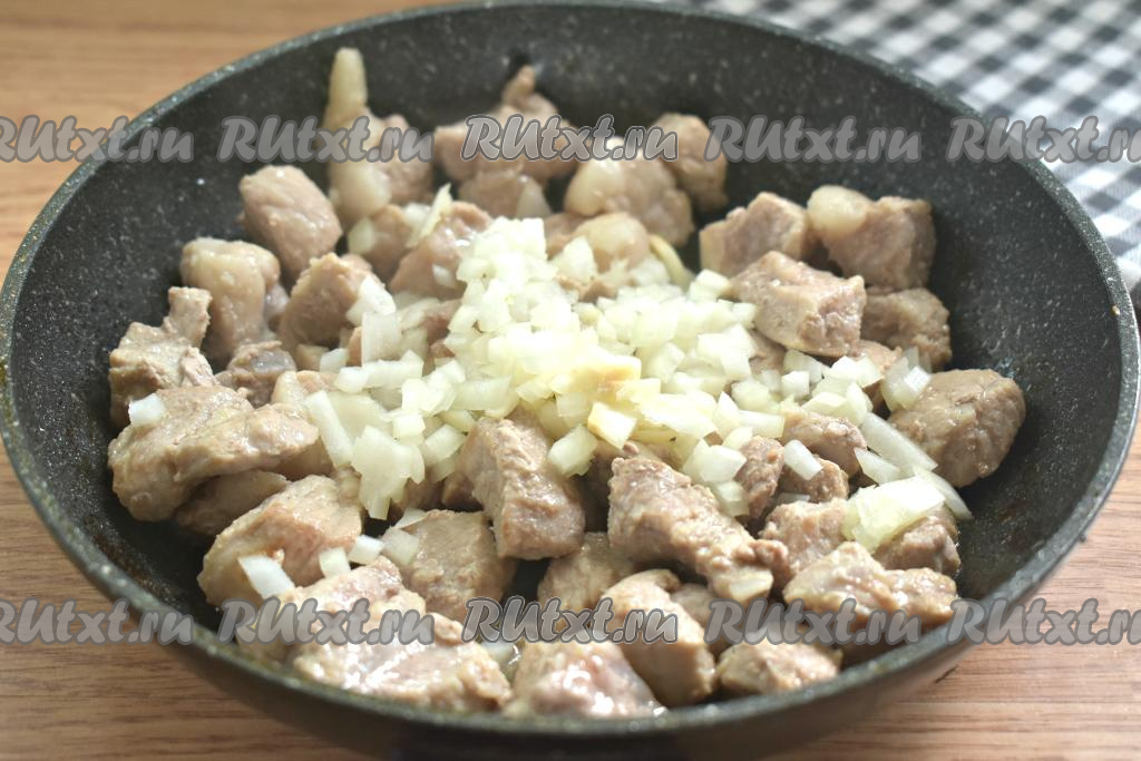 Нарезаем луковицу мелко, добавляем в сковороду к свинине, перемешиваем. Убавляем огонь до среднего и обжариваем мясо с луком, иногда помешивая, 5 минут.