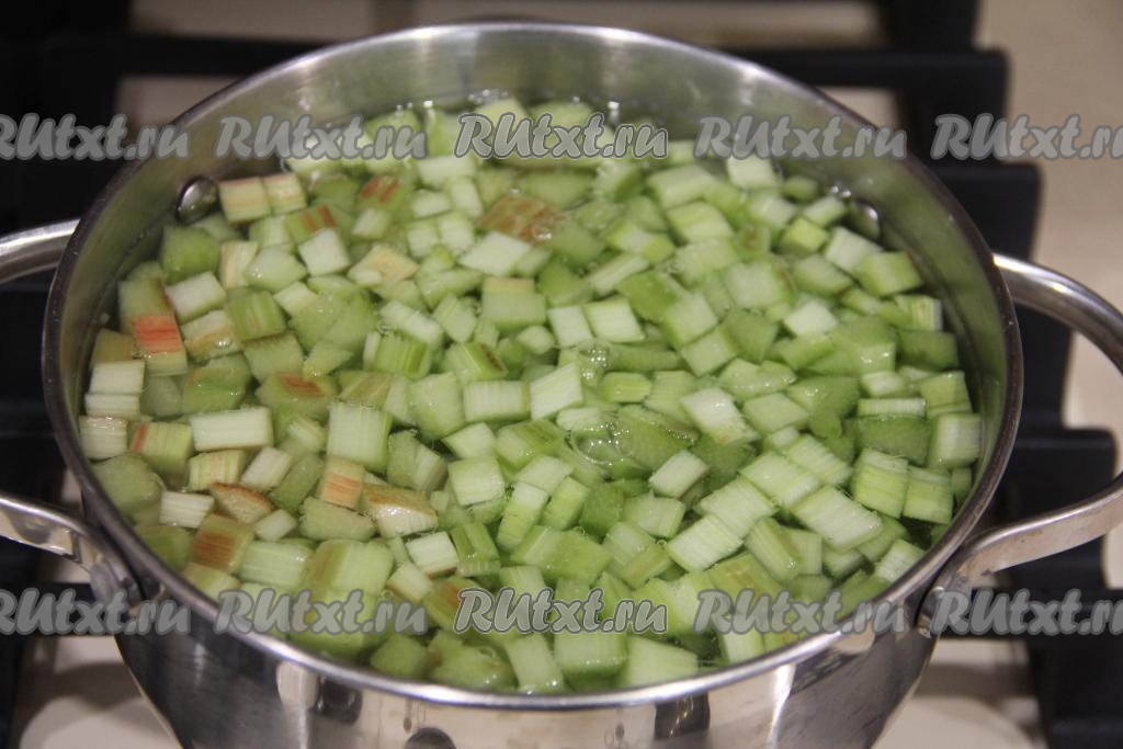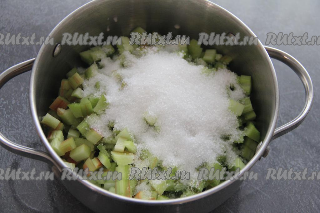 Нарезать стебли ревеня на мелкие кусочки. Выложить кусочки ревень в кастрюлю, всыпать сахар.