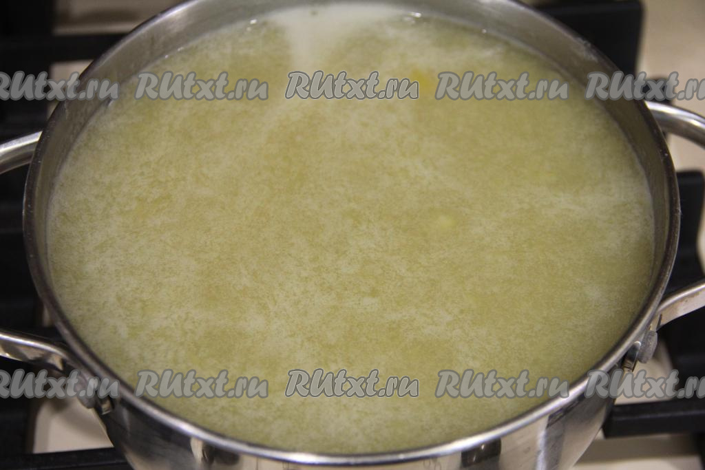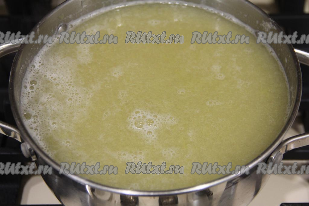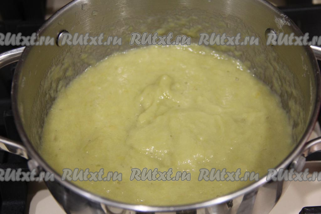 Перелить процеженный компот из ревеня в кастрюлю, добавить пюре из ревеня, перемешать, поставить на огонь, довести до кипения, уменьшить огонь до среднего.