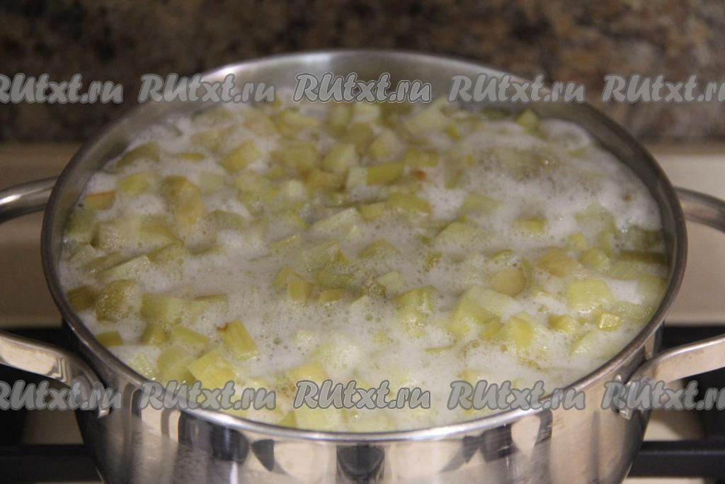 К ревеню с сахаром влить 1,5 литра воды и поставить на огонь.