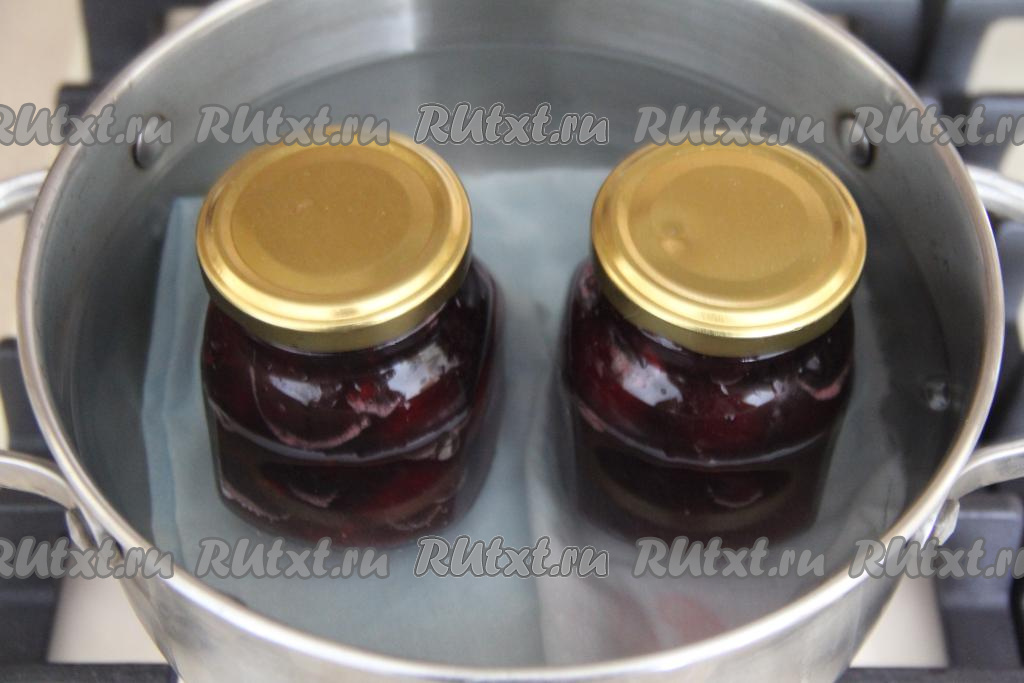 На дно кастрюли выложить небольшое полотенце, поверх него поставить баночки с черешней. Накрыть банки с ягодами крышками. Влить в кастрюлю с банками столько тёплой воды, чтобы она доходила до половины банок. Поставить кастрюлю с баночками на средний огонь. После закипания воды уменьшить немного огонь и стерилизовать банки с черешней 15 минут.