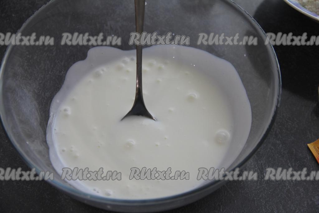 В глубокую миску влить кефир, добавить соду, перемешать получившуюся смесь и оставить на 2-3 минуты. Сода за это время вступит в реакцию с кефиром и смесь запенится.