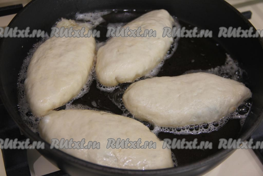 В сковороду влить достаточно количество растительного масла, хорошо разогреть его на сильном огне, уменьшить огонь до среднего. Выложить пирожки в сковороду в один слой швом вниз.
