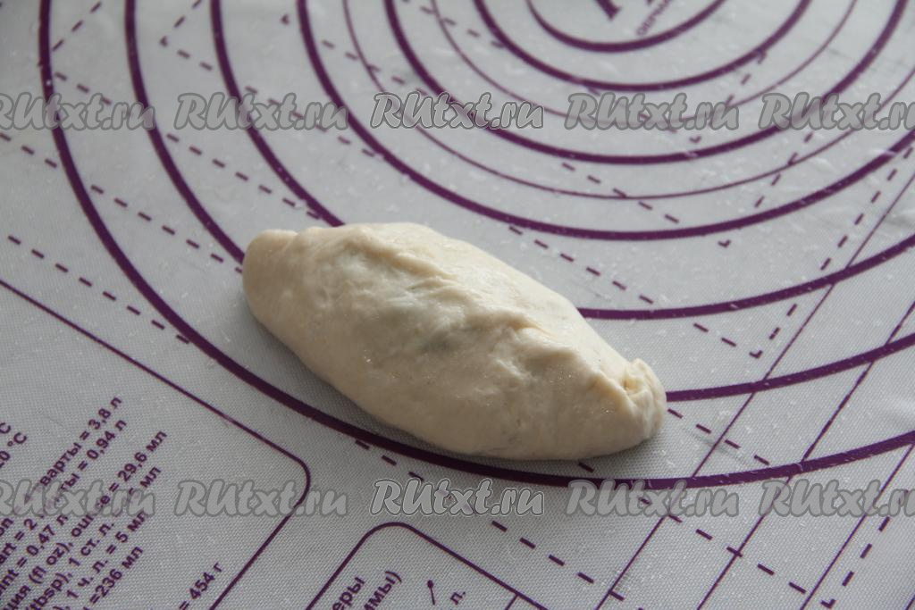 Тесто разделить на 8 частей и раскатать каждую часть на присыпанной мукой поверхности в овал. Можно руки смазать маслом и просто растянуть кусочки теста в овал. Выложить в середину каждого овала 1,5 столовых ложки начинки.
