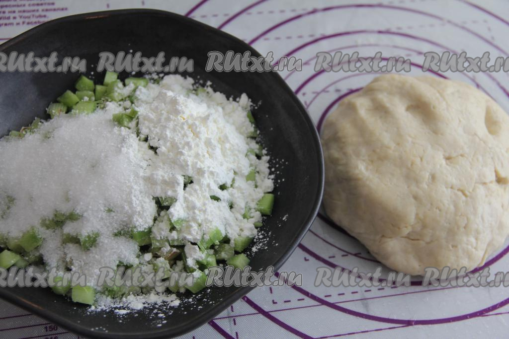 Накрыть тесто полотенцем и оставить на столе на 30 минут. Подготовленный ревень нарезать на маленькие кубики, переложить в миску, добавить сахар и крахмал, перемешать и начинка для пирожков готова.