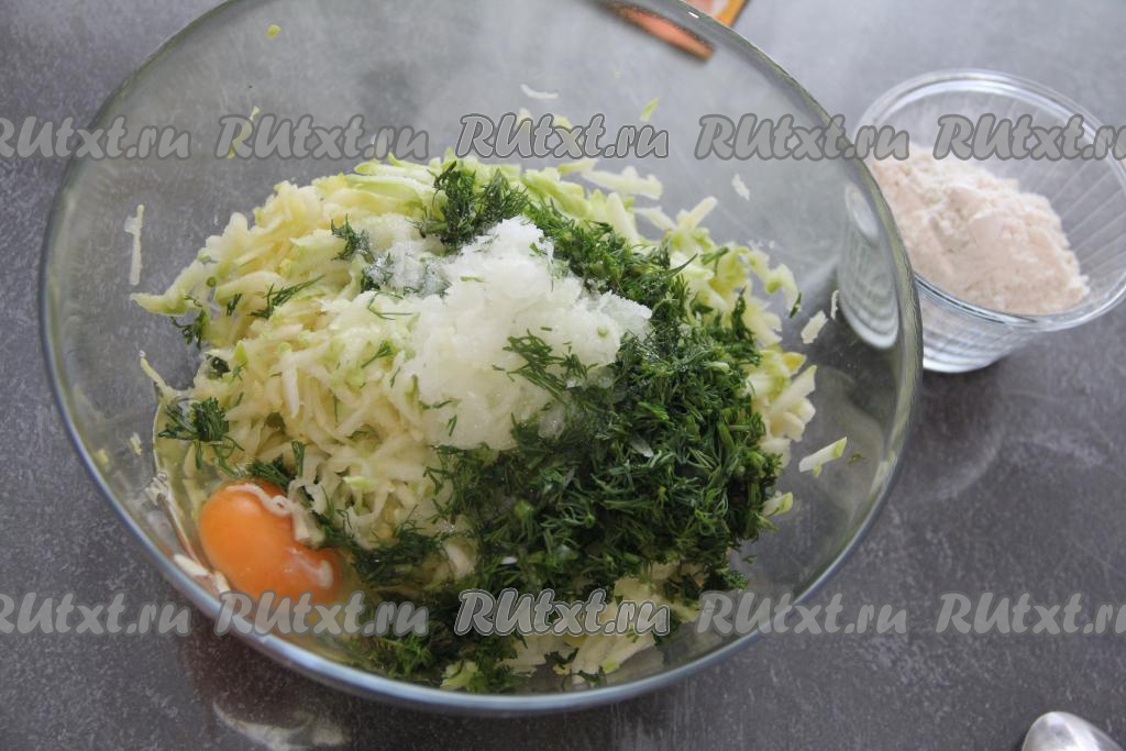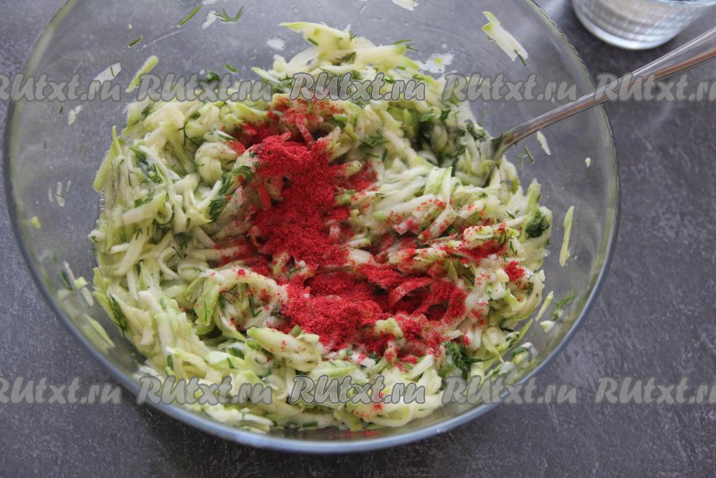 Выложить отжатую мякоть кабачка в миску, добавить соль, лук и мелко нарезанную зелень.