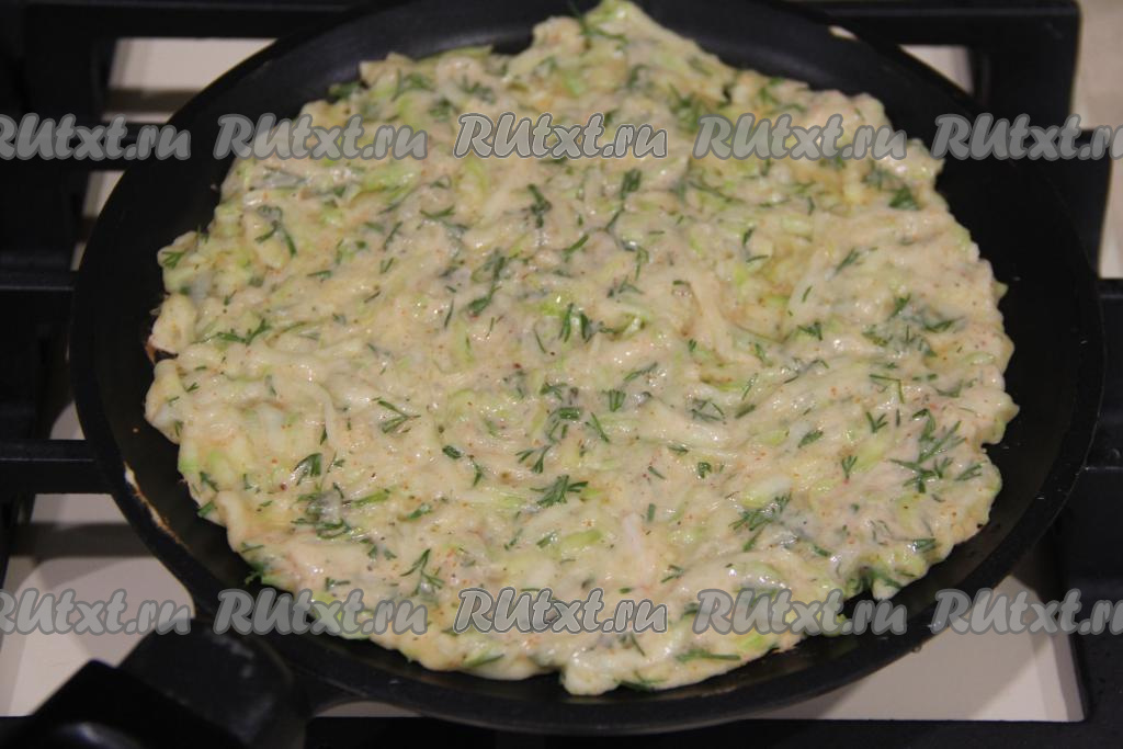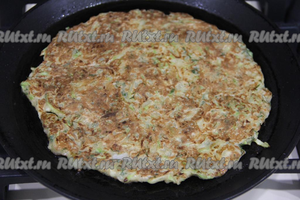 Жарить кабачковую лепёшку с двух сторон на среднем огне до золотистого цвета, затем аккуратно переложить со сковороды на тарелку. Постепенно пожарить все лёпёшки, складывая их одна на другую. Всего у меня получилось 4 лепёшки.
