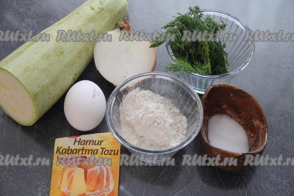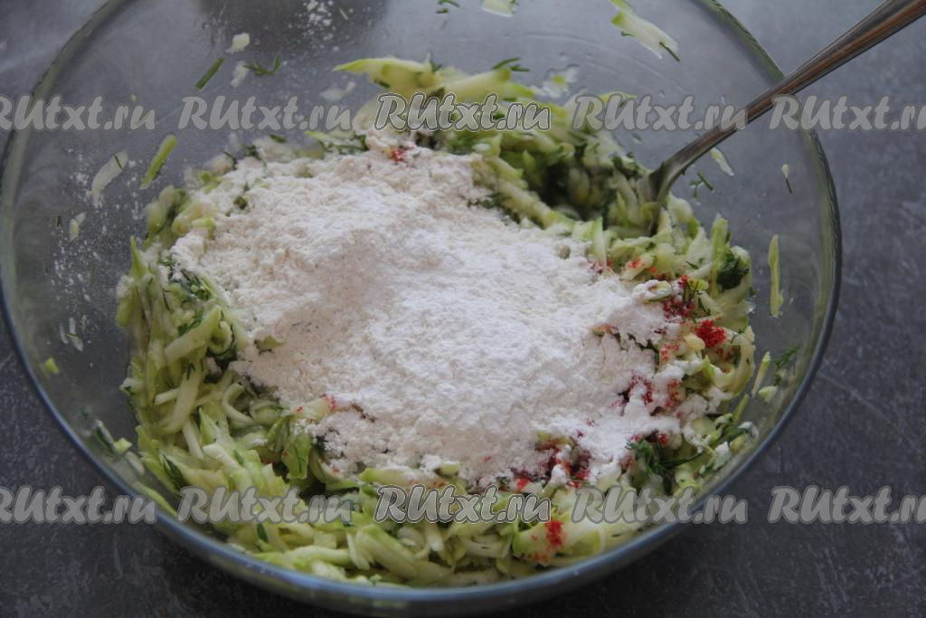 Добавить разрыхлитель и муку, очень хорошо перемешать кабачковое тесто, оно получится в меру густым и вязким.
