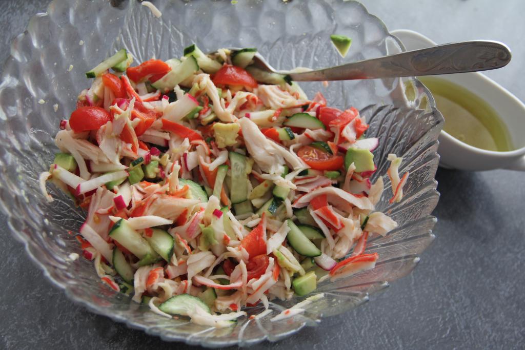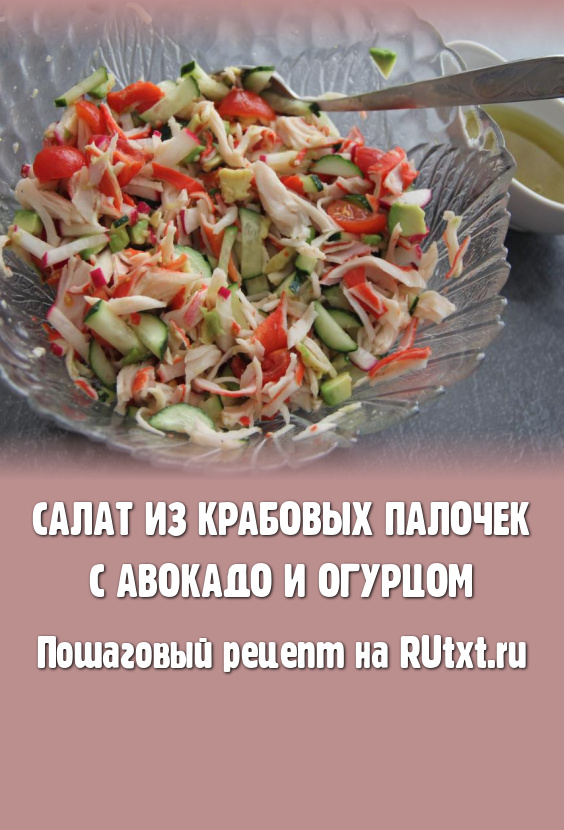Предлагаю рецепт вкусного, яркого, лёгкого салата, который готовится из крабовых палочек с авокадо и огурцами. Заправляется он оливковым маслом и лимонным соком, поэтому такой салатик можно есть и в дни Поста. Подать этот достаточно сытный салат можно в салатнике или в лодочке из авокадо.