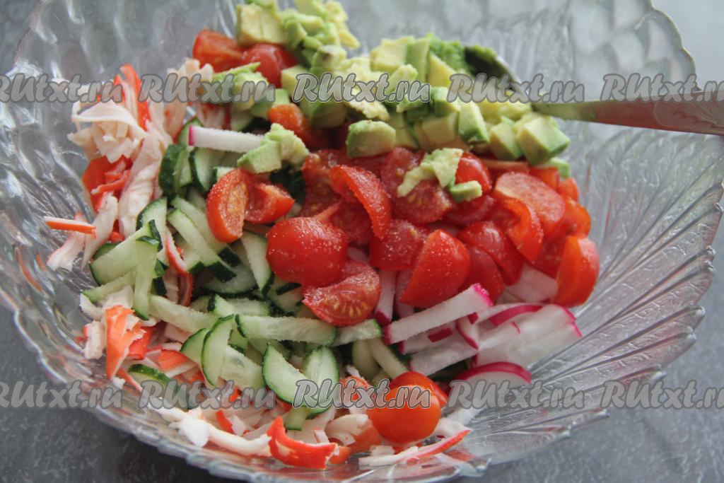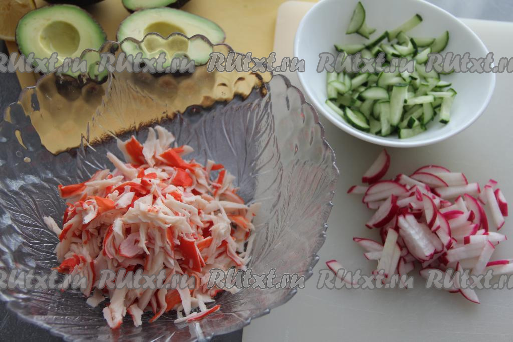Огурцы, помидоры и редиску вымыть. Отрезать у редиски и огурцов кончики с двух сторон. Очистить авокадо от кожуры, удалить косточку. Очищенные авокадо сразу сбрызнуть лимонным соком, чтобы они не потемнели. Разморозить крабовые палочки. Редиску и огурцы нарезать на тонкие брусочки, крабовые палочки - на тонкие полоски.