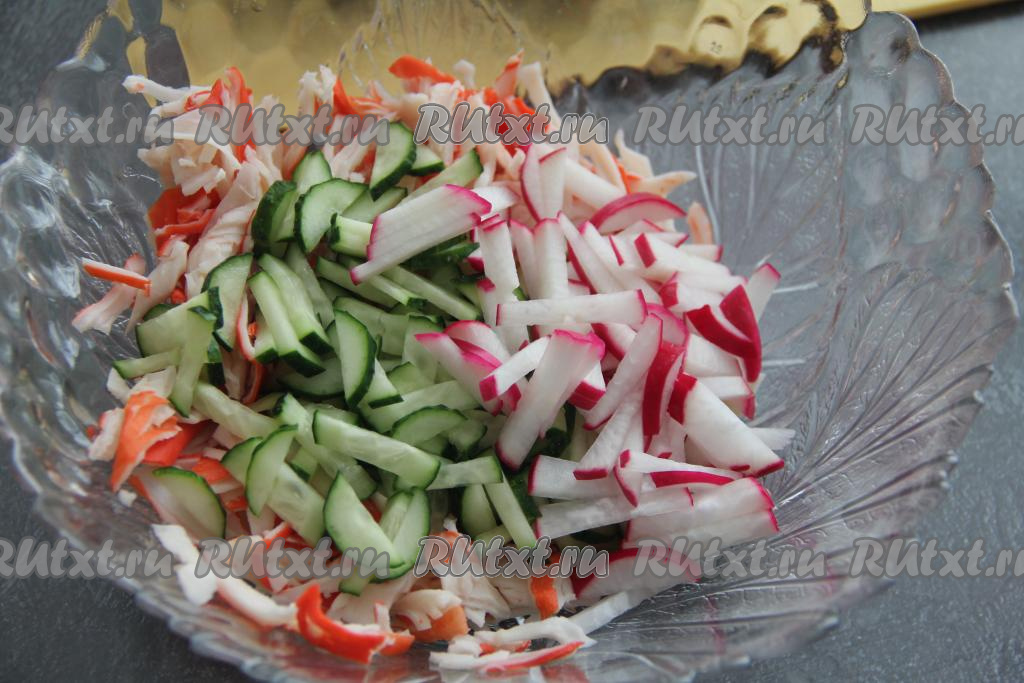 В салатнике соединить крабовые палочки, редиску и огурцы.