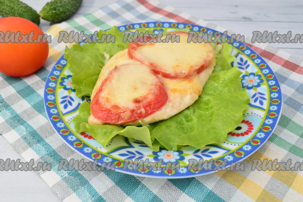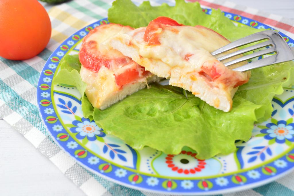 Подать мясо можно на листьях салата. Куриное филе, запечённое под помидорами и сыром в духовке, получается нежным, вкусным и сочным.
