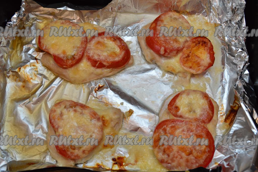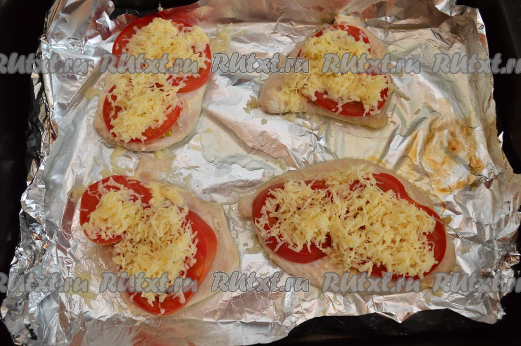 По прошествии 10 минут вынуть противень. Посыпать помидоры сверху натёртым сыром и отправить куриное филе в духовку ещё на 10 минут, чтобы сыр как следует расплавился.