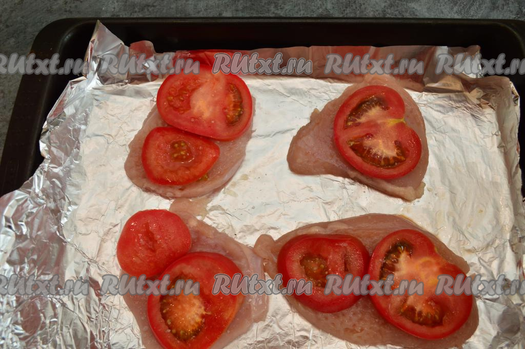 Помидор нарезать острым ножом на тонкие кружочки, выложить поверх мяса и присолить. Запекать куриное филе под помидорами в разогретой до 200 градусов духовке минут 10-15.