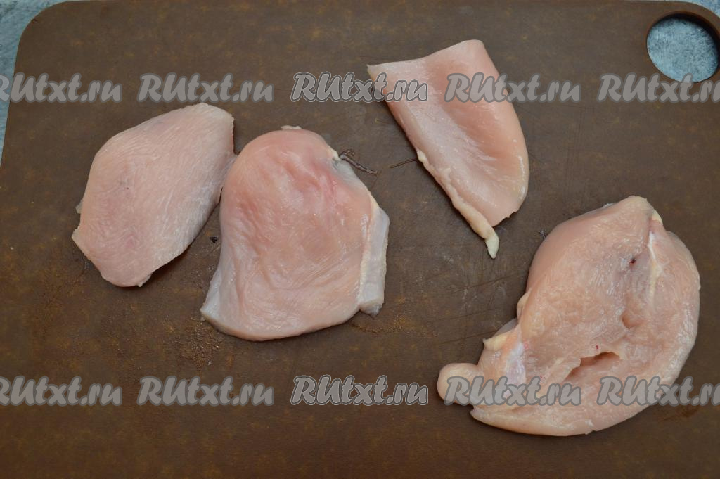 Куриное филе промыть водой, обсушить, нарезать на кусочки толщиной 1-1,5 сантиметра.