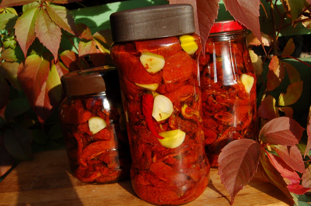 Я добавляю свежий чеснок и свежий острый перец. Затем заливаю оливковым маслом под самую крышку. Закрываю банку и мои вяленые помидоры готовы. Храню их при комнатной температуре. Эти помидоры у меня прекрасно хранились 2 года. Главное условие успешного хранения вяленых помидор - хорошо высушить их в духовке, чтобы они не оказались недосушенными.