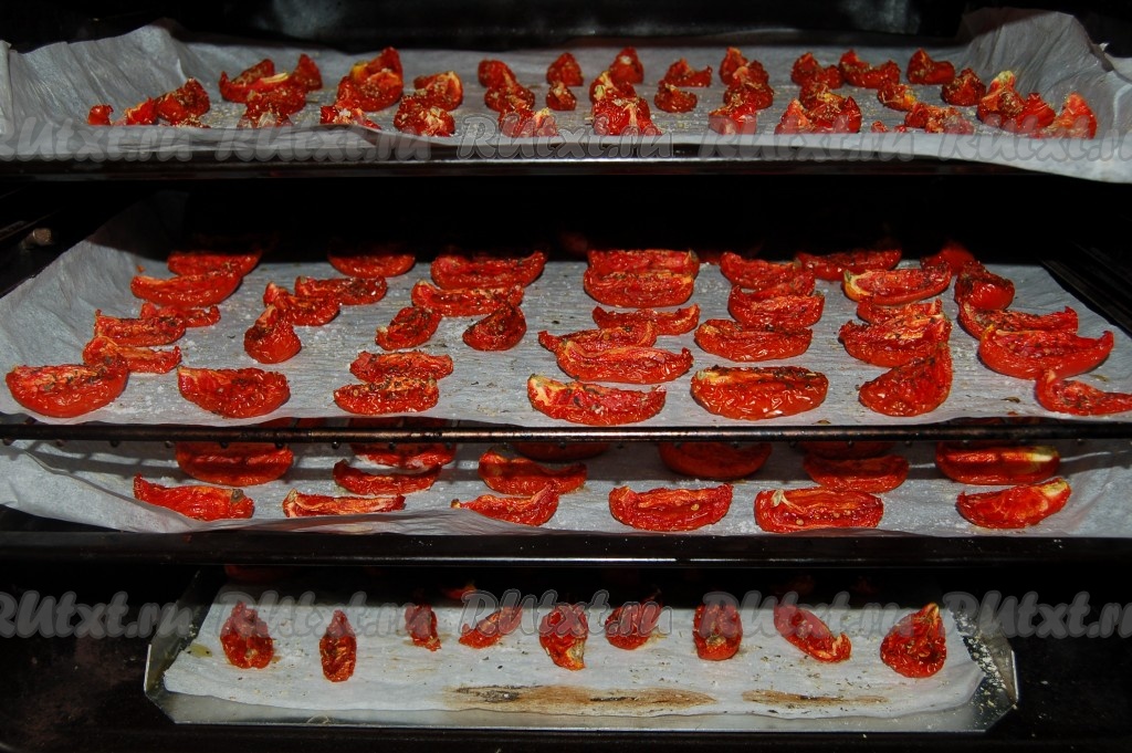 Можно посыпать любимыми специями или какой-нибудь сушеной травкой. Но тут важно не переборщить, иначе травка подгорит и помидоры будут иметь неприглядный вид. Отправить противни с готовыми помидорами в духовку. У кого духовка с конвекторным обдувом, могут разместить в духовке сразу несколько противней. Установить температуру в 70-90 градусов и сушить от 4 до 8 часов. Время готовности зависит от сорта помидор. Чем сочнее сорт, тем дольше они будут вялиться. Время от времени можно переворачивать помидоры.
