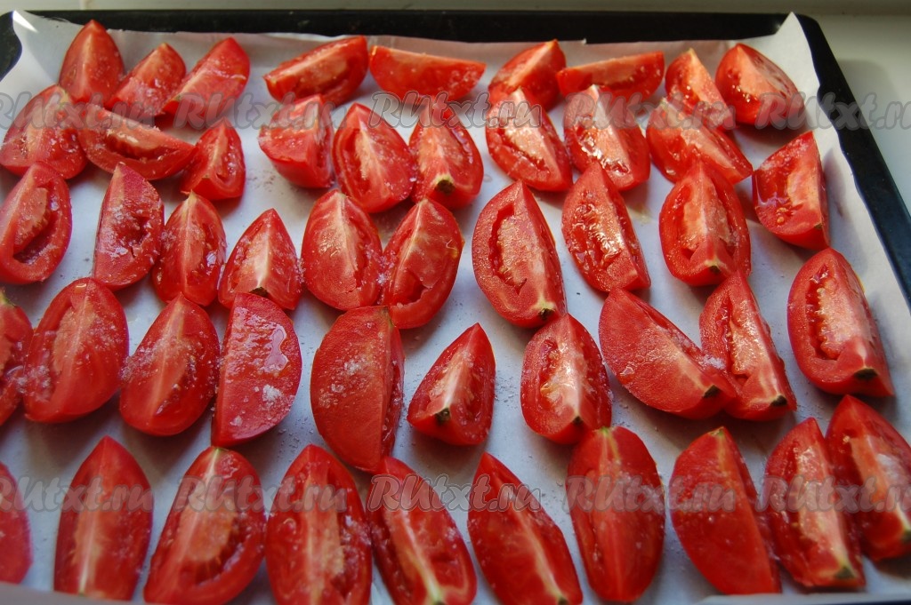 Итак, нужно взять свежие помидоры и нарезать их на четвертинки. Помидоры для вяленья желательно брать не сочные, идеальны для этого - сливовидные помидоры, типа дамских пальчиков. Выложить разрезанные помидоры на противни на бумагу для выпекания. Сверху каждую помидорку посыпать солью.
