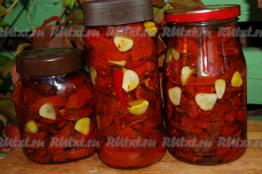 Разложить готовые вяленые помидоры по чистым банкам. В каждую банку добавить любимые добавки, в виде свежих долек чеснока, острого перца, горошин перца. Если добавлять траву, то только в сушеном виде, свежая трава не даст долго храниться вашим вяленым помидорам.