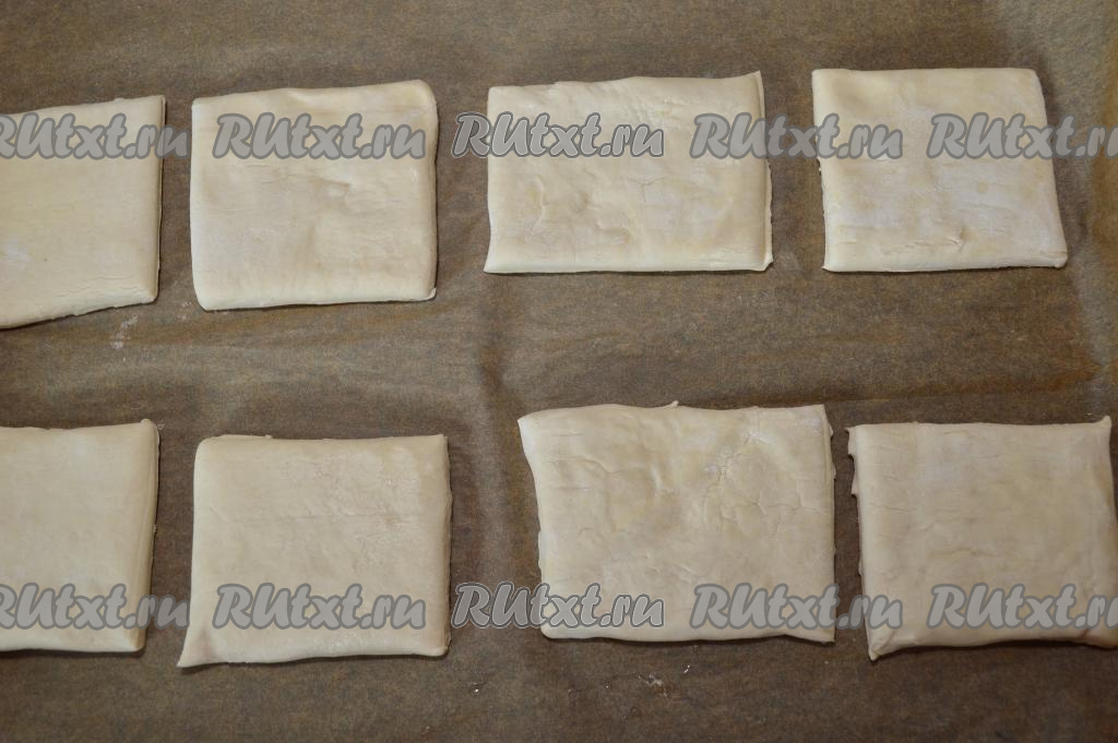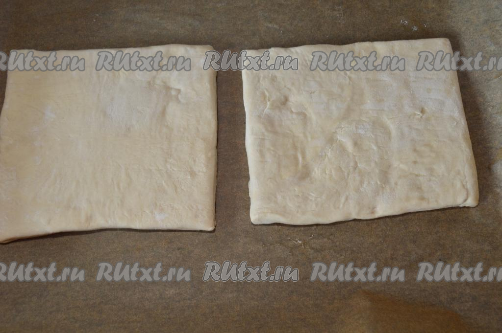 На пекарскую бумагу выложить слоёное тесто. У меня упаковка теста была из двух квадратных пластов.