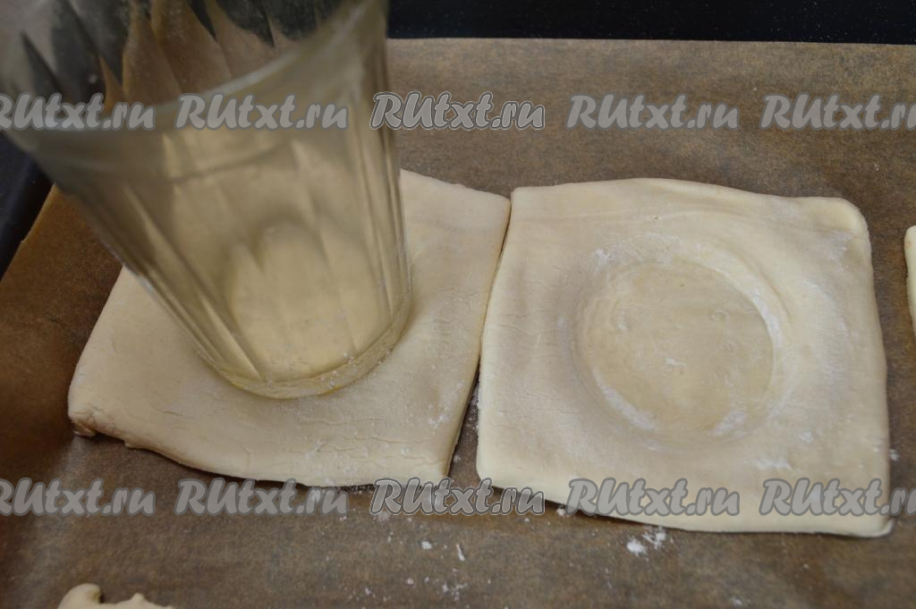 Дном гранёного стакана в центре каждого квадрата сделать углубление. Если стакан прилипает к поверхности теста, тогда припылите квадратики теста немножко мукой.