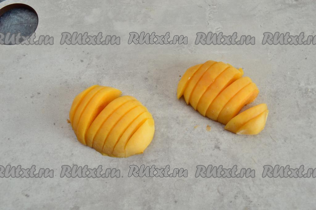 Абрикосы разделить на половинки, удаляя косточки. Половины абрикосов острым ножом разрезать на тонкие кусочки.