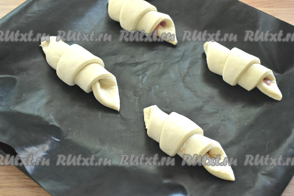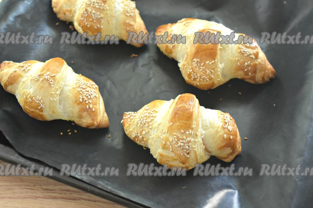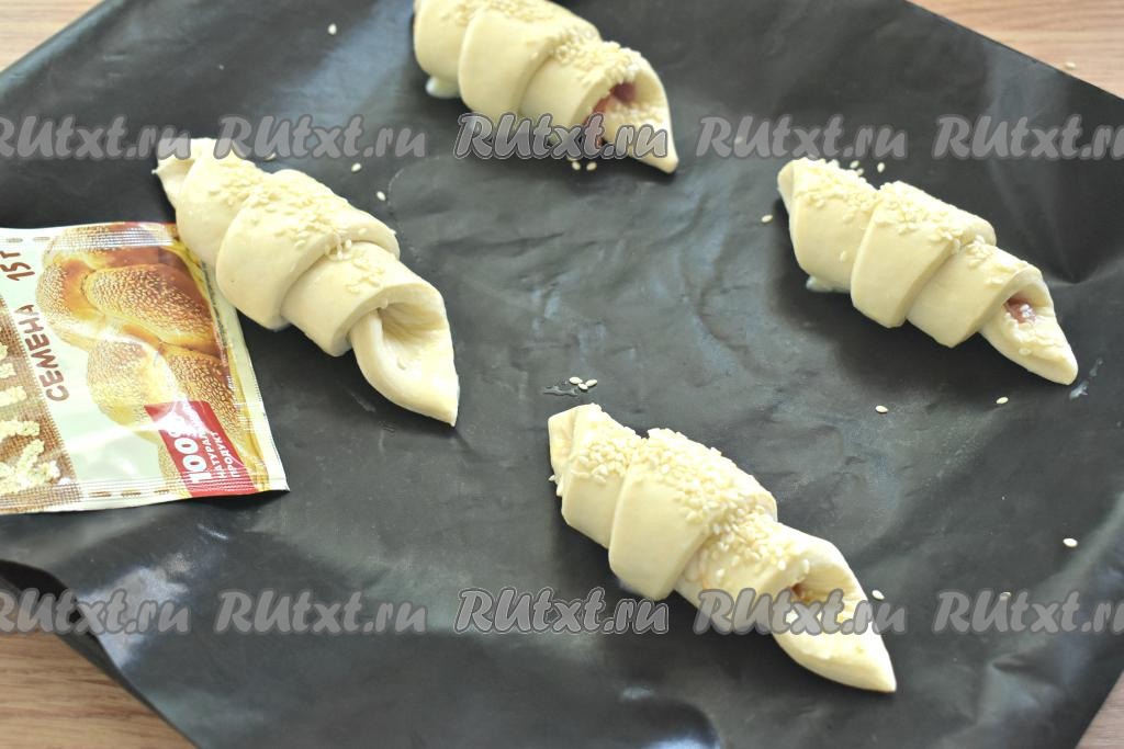 Круассаны смазываем взбитым яйцом и, по желанию, посыпаем кунжутом. Отправляем противень в разогретую до 200 градусов духовку.
