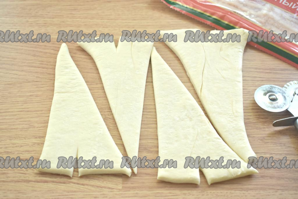 Теперь каждый прямоугольник разрезаем по диагонали. Из одного пласта теста получается 4 треугольных заготовки. У основания каждого треугольника делаем небольшой надрез, уголки немного разводим в стороны.