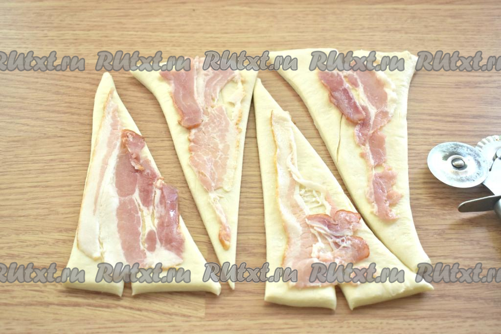 Полоски бекона разрезаем наискосок на 2 части и выкладываем на тесто, как на фото.