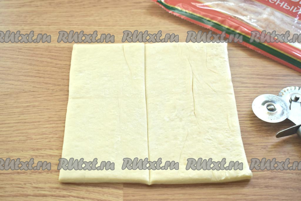 Рабочую поверхность слегка присыпаем мукой, выкладываем пласт слоёного теста, разрезаем его пополам (получаются прямоугольники).