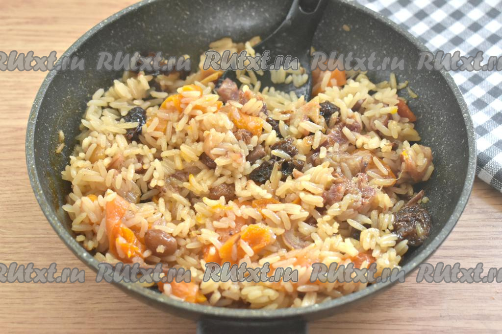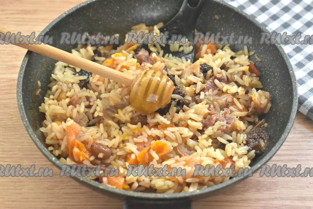 Готовый плов с сухофруктами пробуем, по желанию, добавляем в него мёд или сахар, перемешиваем.