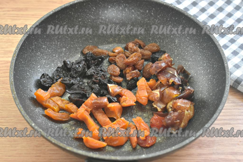 На сковороду вливаем растительное масло, выкладываем изюм и нарезанные курагу, чернослив и финики.