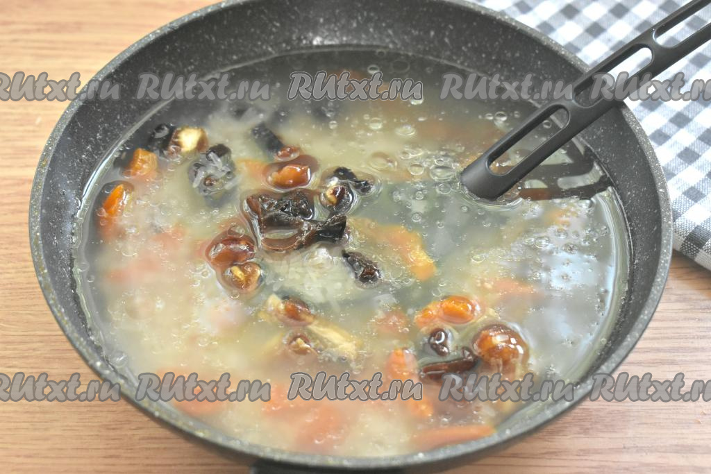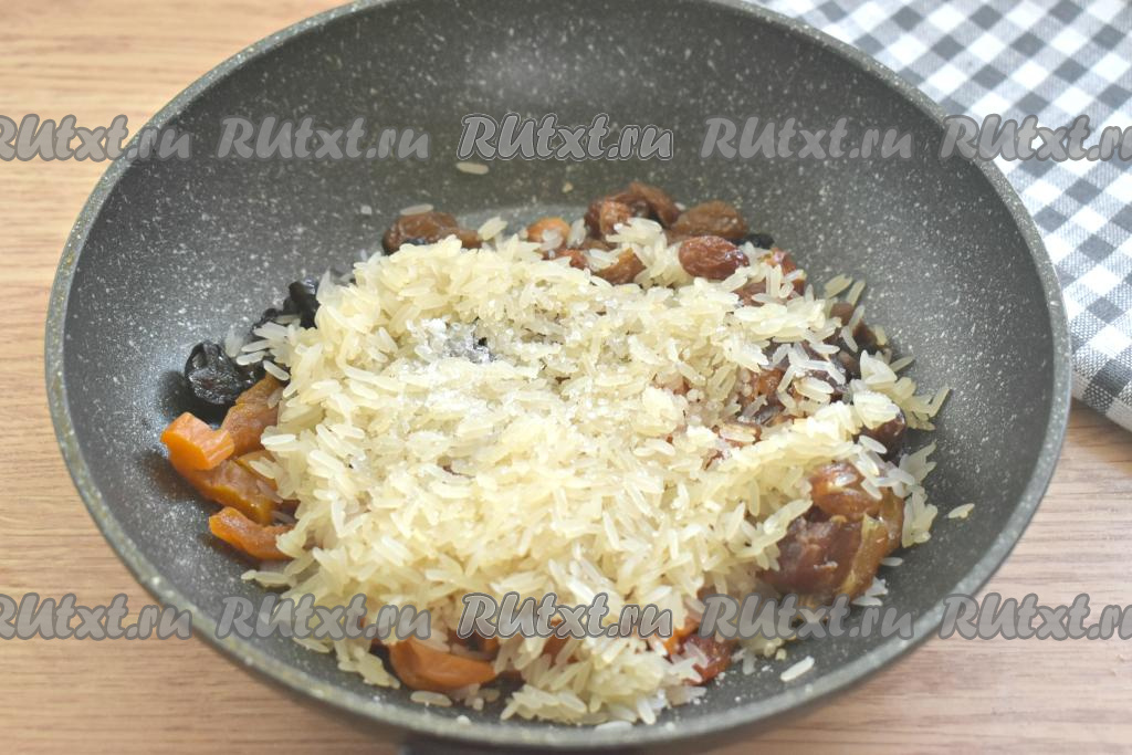 Сухофрукты с рисом заливаем кипячёной водой, перемешиваем, ставим на огонь.