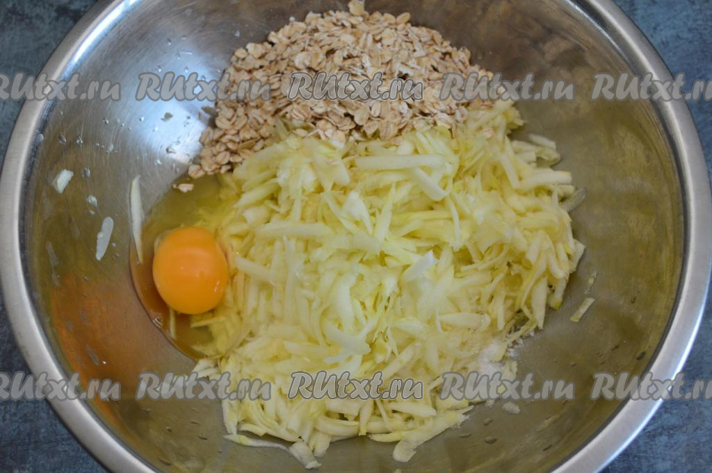 В миску к кабачку, отжатому от сока, всыпать овсяные хлопья, вбить сырое яйцо и добавить соль по вкусу (я добавила 3 щепотки соли).